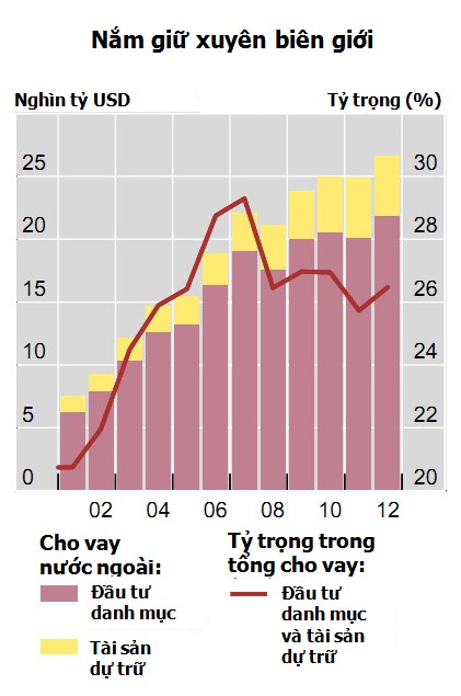 Biểu đồ trên cho thấy, mặc dù rất nỗ lực giảm nợ, nhưng khu vực đồng euro vẫn là nơi có tỷ lệ nợ nước ngoài cao nhất. Kế đến là Anh, Mỹ, Nhật và các thị trường mới nổi.