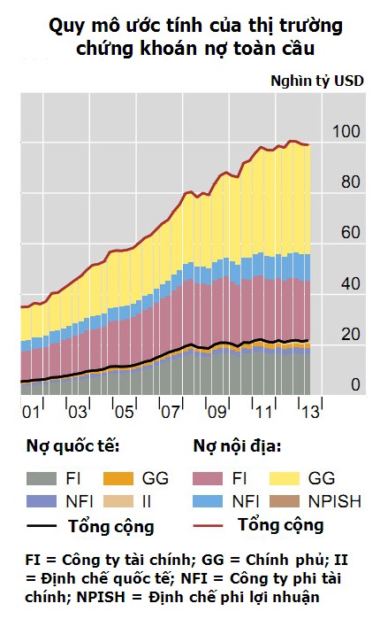 Biểu đồ trên cho thấy, các chính phủ là những người phát hành trái phiếu bận rộn nhất, với khối lượng nợ công tăng 80% từ trước khủng hoảng tài chính 2007 đến giữa 2013. Với sự thắt chặt cho vay của ngân hàng, các doanh nghiệp cũng đã đẩy mạnh phát hành trái phiếu để tìm nguồn tài trợ thay thế.