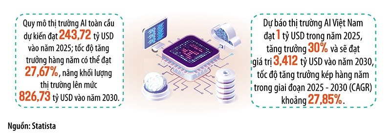 Việt Nam đang nổi lên như một điểm sáng về AI trong bản đồ AI toàn cầu. Theo báo cáo của Google, Temasek và Bain & Company, nền kinh tế số của Việt Nam dự kiến đạt 57 tỷ USD vào năm 2025, với tốc độ tăng trưởng hàng năm lên tới 31%. Trong đó, AI được xem là động lực chính thúc đẩy chuyển đổi số toàn diện. Nếu được áp dụng rộng rãi, các công cụ AI tại Việt Nam có thể mang lợi ích kinh tế ước tính lên tới 1,89 triệu tỷ đồng (79,3 tỷ USD) cho các doanh nghiệp vào năm 2030.