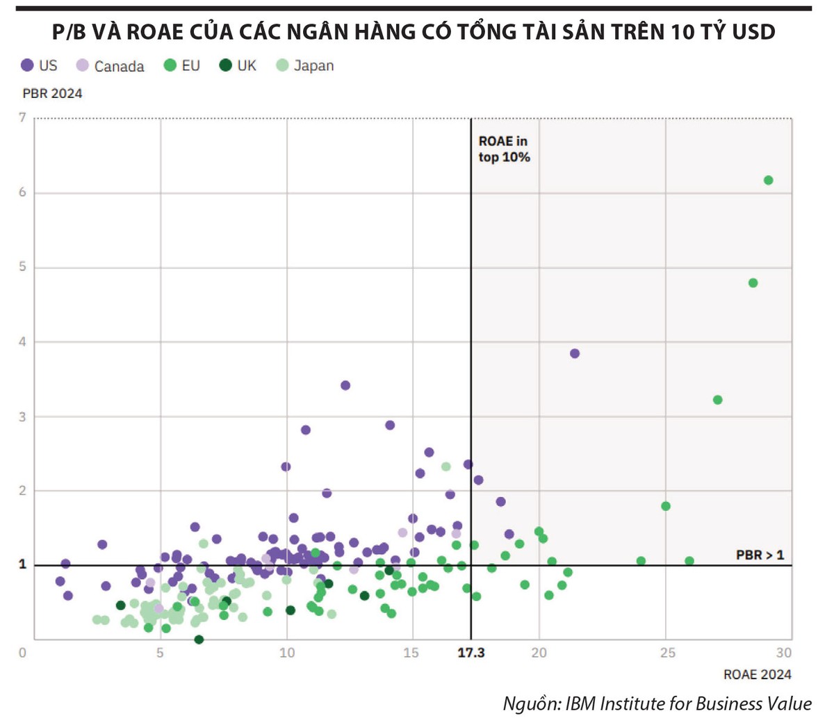 Báo cáo đã phân tích tỷ suất lợi nhuận trên vốn chủ sở hữu bình quân (ROAE) và định giá P/B (thị giá cổ phiếu trên giá trị sổ sách) của hơn 600 ngân hàng niêm yết có tổng tài sản trên 10 tỷ USD. Quan sát cho thấy, phần lớn ngân hàng tập trung ở góc dưới bên trái của biểu đồ “P/B và ROAE của các ngân hàng có tổng tài sản trên 10 tỷ USD”, nơi P/B dao động quanh hoặc dưới mức 1 và ROAE ở mức thấp. Nhìn chung, các ngân hàng Nhật Bản và Trung Quốc đang hoạt động trong môi trường bị hạn chế hơn nhiều so với các đối tác quốc tế. ROAE trung vị của ngân hàng Nhật chỉ bằng một nửa Mỹ và thấp hơn hơn ba lần so với châu Âu. Trong khi đó, ngân hàng Bắc Mỹ giao dịch với mức P/B cao hơn các nền kinh tế phát triển khác, trung bình 1,6 tại Canada và 2,0 tại Mỹ.