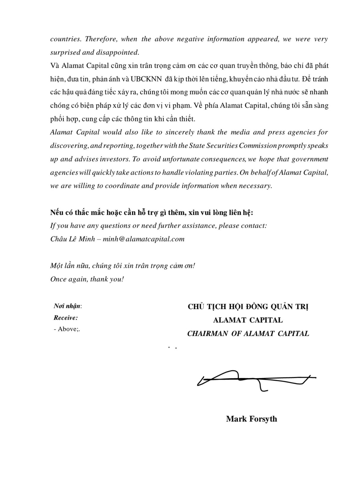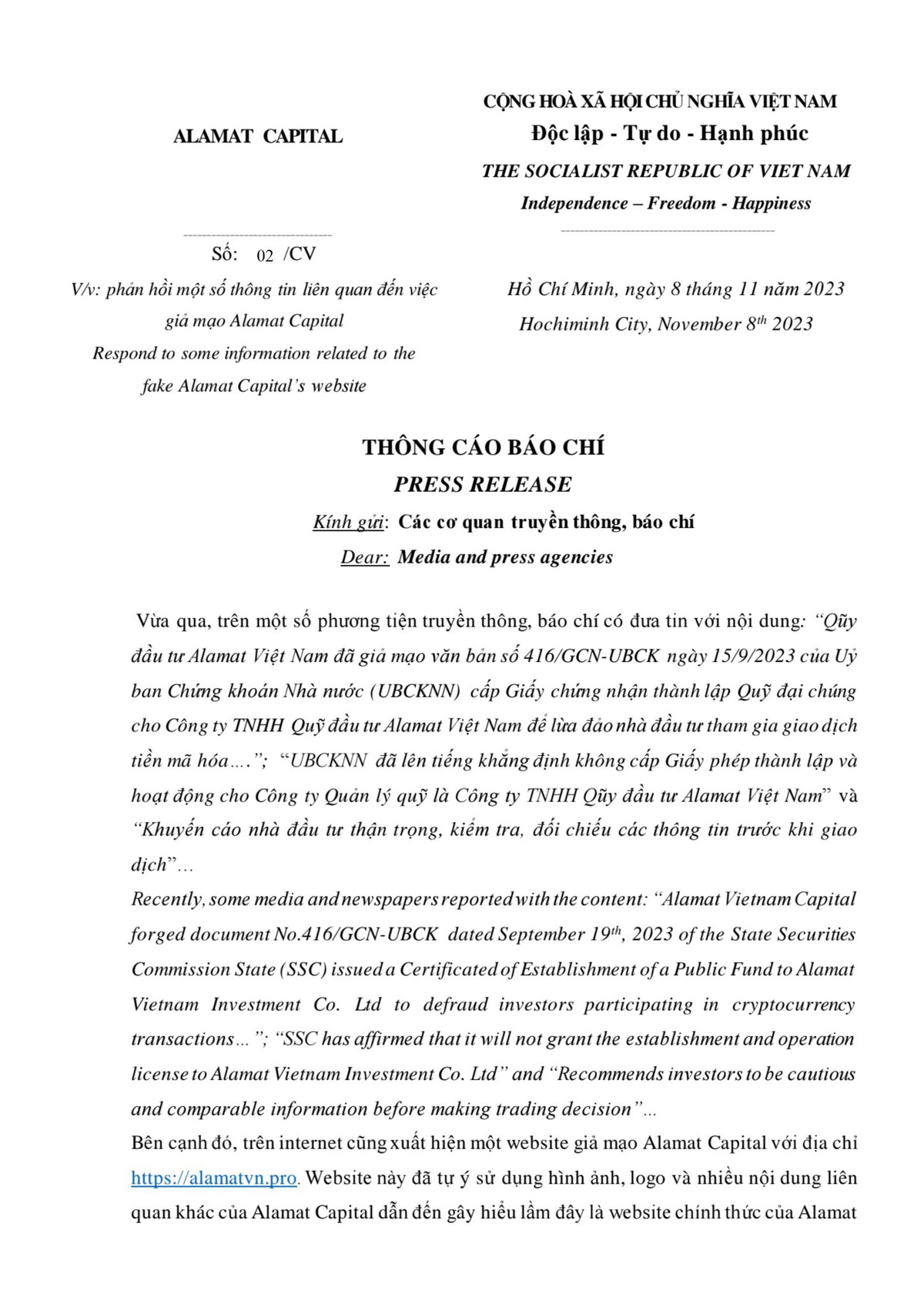 Thông báo của Alamat Capital do ông Mark Forsyth - Nhà sáng lập - Chủ tịch HĐQT Alamat Capital ký tên cho biết, vừa qua, trên một số phương tiện truyền thông, báo chí có đưa tin với nội dung: “Quỹ đầu tư Alamat Việt Nam đã giả mạo văn bản số 416/GCN-UBCK ngày 15/9/2023 của Uỷ ban Chứng khoán Nhà nước (UBCKNN) cấp Giấy chứng nhận thành lập Quỹ đại chúng cho Công ty TNHH Quỹ đầu tư Alamat Việt Nam để lừa đảo nhà đầu tư tham gia giao dịch tiền mã hóa….”; “UBCKNN đã lên tiếng khẳng định không cấp Giấy phép thành lập và hoạt động cho Công ty Quản lý quỹ là Công ty TNHH Quỹ đầu tư Alamat Việt Nam” và “Khuyến cáo nhà đầu tư thận trọng, kiểm tra, đối chiếu các thông tin trước khi giao dịch”…