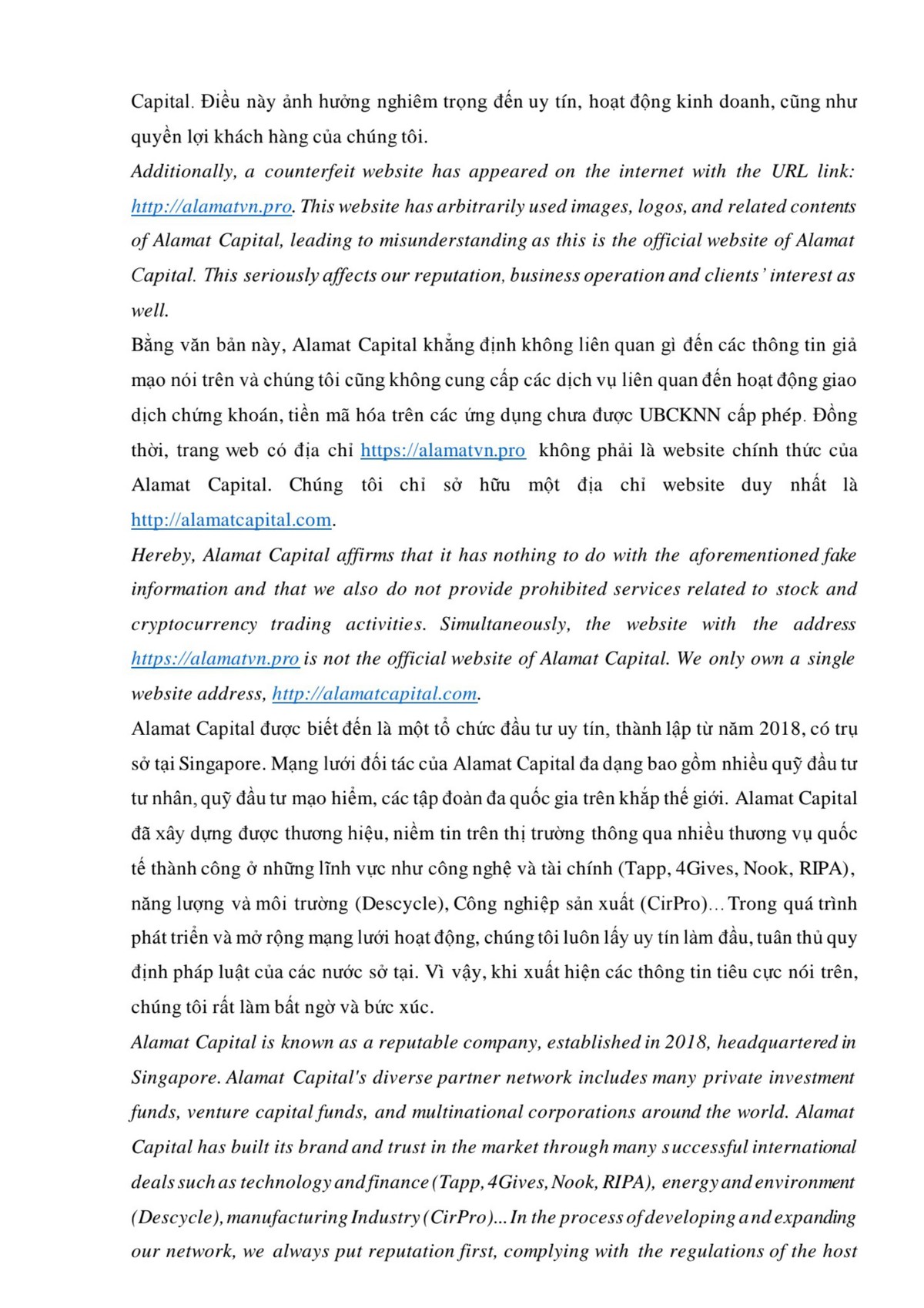 "Điều này ảnh hưởng nghiêm trọng đến uy tín, hoạt động kinh doanh, cũng như quyền lợi khách hàng của chúng tôi. Bằng văn bản này, Alamat Capital khẳng định không liên quan gì đến các thông tin giả mạo nói trên và chúng tôi cũng không cung cấp các dịch vụ liên quan đến hoạt động giao dịch chứng khoán, tiền mã hóa trên các ứng dụng chưa được UBCKNN cấp phép. Đồng thời, trang web có địa chỉ https://alamatvn.pro không phải là website chính thức của Alamat Capital. Chúng tôi chỉ sở hữu một địa chỉ website duy nhất là http://alamatcapital.com", thông báo của Alamat khẳng định.