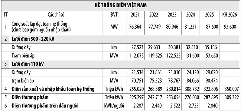 Năm 2025, sản lượng điện sản xuất và nhập khẩu cả nước ước đạt 322,8 tỷ kWh, tăng 4,6% so với năm 2024. Nếu tính khoảng 10 tỷ kWh điện mặt trời mái nhà tự sản tự tiêu không qua lưới điện quốc gia thì tổng sản lượng điện là khoảng 332,8 tỷ kWh.