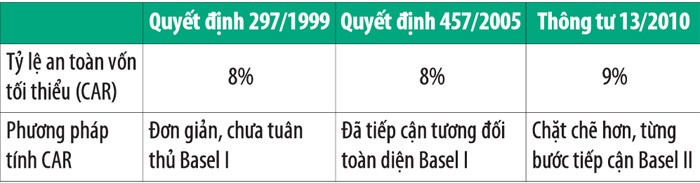 Cụ thể, theo quy định của Thông tư 13, cách tính tổng vốn, bao gồm vốn cấp 1 và vốn cấp 2 đã khá tương đồng với Basel II, nhưng phần mẫu số mới chỉ xác định rủi ro tín dụng, chưa tính đến rủi ro thị trường và rủi ro tác nghiệp.