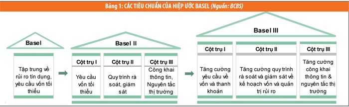 Từ Basel I ban đầu chỉ chú trọng đến rủi ro tín dụng, đến Basel II, với ba cột trụ đưa ra các quy định không chỉ về quản trị rủi ro tín dụng, rủi ro hoạt động, rủi ro thị trường, mà còn tập trung cả về hệ thống kiểm soát nội bộ và giám sát của ngân hàng, các nguyên tắc thị trường và công bố thông tin.