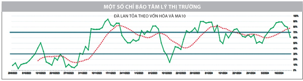 Hiện tại, tâm lý thị trường dần yếu đi khi đà lan tỏa ngắn hạn tạo đỉnh gần mức 90% và xuyên xuống dưới MA10 của chính chỉ số. Áp lực điều chỉnh được ghi nhận đến từ tất cả các nhóm ngành trong phiên cuối tuần, đặc biệt là nhóm cổ phiếu vốn hóa lớn và ngân hàng - nhóm đóng vai trò dẫn dắt nhịp tăng trong 2 tháng trở lại đây. Vì vậy, không quá khó để nhận thấy mức độ ảnh hưởng tới vận động của chỉ số thị trường thời gian tới.
