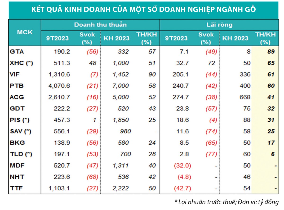 Tính đến hết tháng 9/2023, trong 14 doanh nghiệp ngành gỗ niêm yết và đăng ký giao dịch có 6 doanh nghiệp chưa hoàn thành một nửa kế hoạch doanh thu và lợi nhuận năm 2023, nhiều doanh nghiệp khác chỉ hoàn thành khoảng 60% mục tiêu. Trong đó, Gỗ An Cường đã phải điều chỉnh giảm mục tiêu doanh thu từ tháng 7/2023.