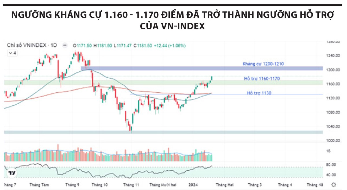 Tuần giao dịch từ 15 - 19/1/2024 khiến giới đầu tư hài lòng khi VN-Index tăng 2,39%, đạt 1.181,5 điểm. Nhịp tăng của chỉ số khá mạnh, vượt qua vùng kháng cự 1.160 - 1.170 điểm, qua đó mở ra cơ hội tiến tới vùng kháng cự tiếp theo ở 1.190 - 1.200 điểm.