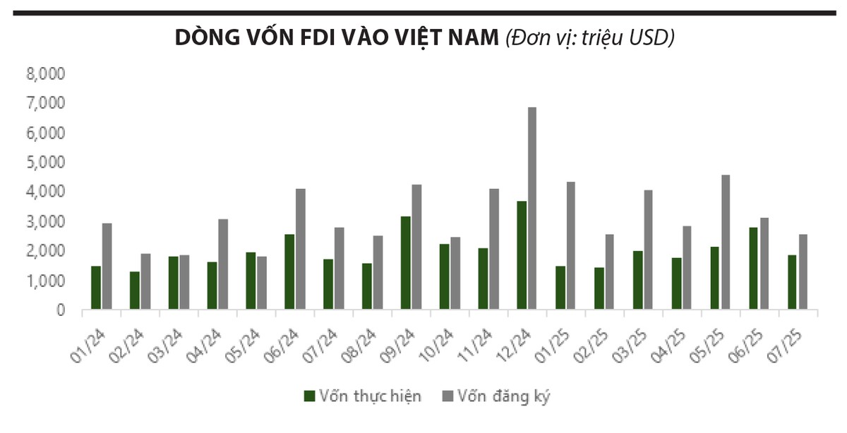 Theo đánh giá của chúng tôi, dòng vốn FDI vào Việt Nam vẫn duy trì xu hướng tích cực, phản ánh sức hấp dẫn bền vững của nền kinh tế trong mắt các nhà đầu tư nước ngoài. Thỏa thuận thuế quan mới giữa Việt Nam và Mỹ được xem là yếu tố hỗ trợ quan trọng, giúp giảm thiểu nguy cơ dịch chuyển của các doanh nghiệp FDI sang các quốc gia cạnh tranh khác như Bangladesh hay Ấn Độ, trong khi mức thuế quan tại Việt Nam ở mức tương đối cạnh tranh.