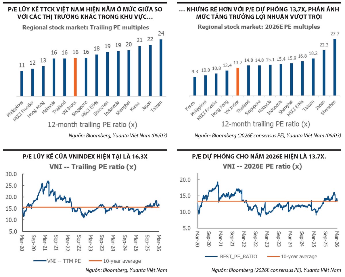 Về định giá, VN-Index đang giao dịch ở mức P/E dự phóng cho năm 2026 vào khoảng trên 11 lần. So với khu vực châu Á, P/E của Việt Nam nằm ở mức trung bình thấp nếu loại trừ các thị trường phát triển như Hàn Quốc, Nhật Bản và Đài Loan (Trung Quốc). Điều này cho thấy, dù có chiết khấu so với đỉnh điểm trước đó, thị trường vẫn chưa hấp dẫn đủ để thu hút dòng tiền lớn trong ngắn hạn.