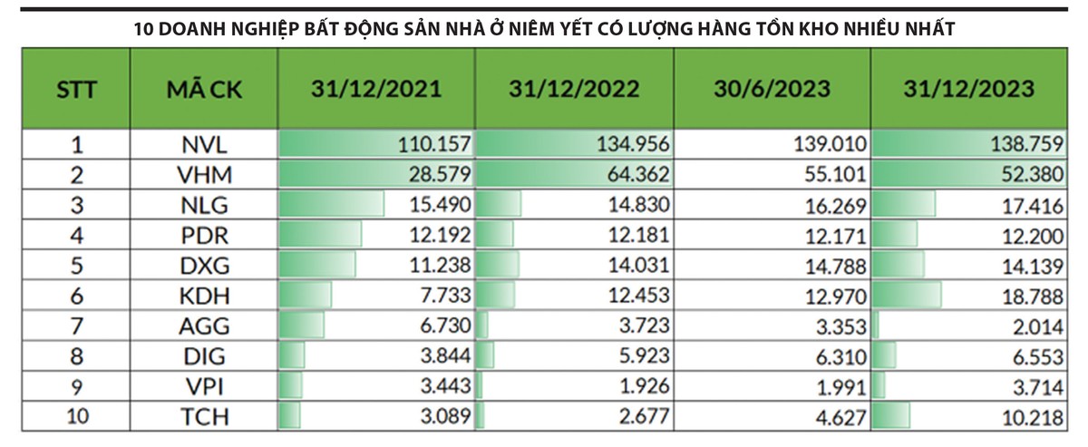 Thống kê 10 doanh nghiệp bất động sản nhà ở niêm yết có lượng hàng tồn kho nhiều nhất (xem bảng) cho thấy, tổng giá trị hàng tồn kho tính đến cuối năm 2023 đạt hơn 276.000 tỷ đồng (tương đương khoảng 11 tỷ USD), tăng hơn 3% so với đầu năm. Trong đó, giá trị hàng tồn kho của Novaland (mã NVL) là cao nhất, chiếm một nửa với gần 139.000 tỷ đồng và tương đương 57% tổng tài sản của doanh nghiệp này; tiếp theo là Vinhomes (mã VHM) với hơn 52.000 tỷ đồng, chiếm hơn 11% tổng tài sản; Khang Điền (mã KDH) là hơn 18.800 tỷ, chiếm hơn 71% tổng tài sản; Nam Long (mã NLG) là hơn 17.400 tỷ đồng, chiếm hơn 60% tổng tài sản; Đất Xanh (mã DXG) là hơn 14.100 tỷ đồng, chiếm hơn 47% tổng tài sản; Phát Đạt (mã PDR) là hơn 12.200 tỷ đồng, chiếm hơn 58% tổng tài sản; Hoàng Huy (mã TCH) là 10.218 tỷ đồng, chiếm 61% tổng tài sản…
