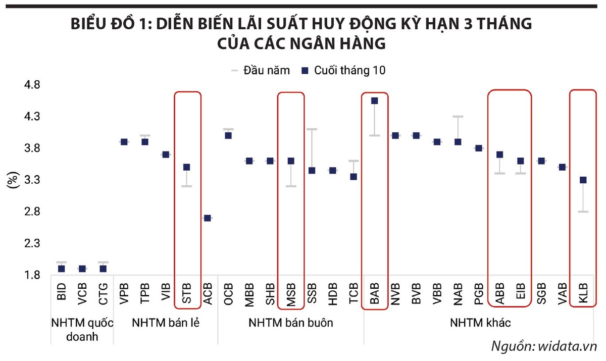 Ngược lại, nhóm ngân hàng tư nhân lại chứng kiến diễn biến phân mảnh hơn. Trong nhóm bán lẻ, Sacombank (mã STB) nổi bật với mức tăng lãi suất huy động rõ rệt nhất, đạt 3,5%/năm vào cuối tháng 10, tăng 30 điểm cơ bản so với đầu năm. Mặc dù tốc độ tăng trưởng tín dụng và huy động của Sacombank khá cân bằng, sự nhạy cảm của ngân hàng này trước biến động lãi suất huy động xuất phát từ cơ cấu vốn đặc thù: Có tới 76% tổng nguồn vốn đến từ tiền gửi khách hàng, cao hơn đáng kể so với mức trung bình 60% của nhóm ngân hàng bán lẻ. (Bang 1)