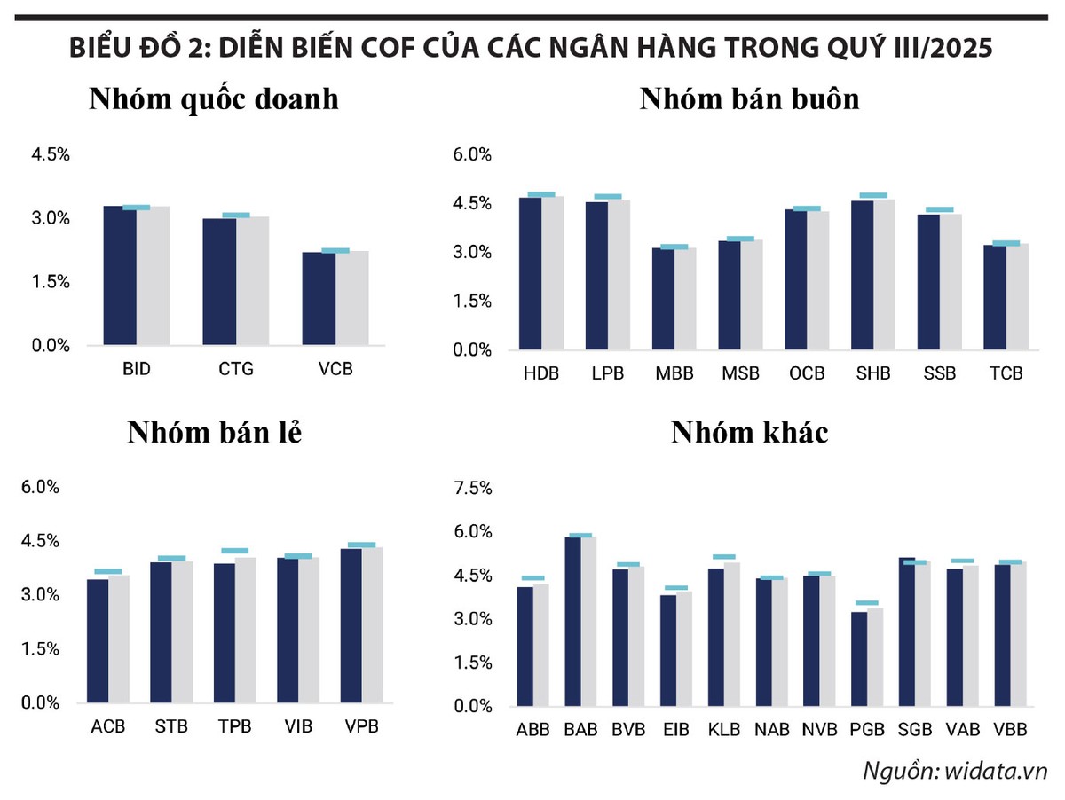 Tổng thể, xu hướng COF nhích lên ở hầu hết ngân hàng cho thấy áp lực huy động vốn đang dần quay trở lại trong năm 2025. Diễn biến này phần nào phản ánh chênh lệch cho vay - huy động ngày càng nới rộng cùng yếu tố mùa vụ thanh khoản khiến lãi suất huy động tăng nhẹ từ cuối quý III/2025. Tuy nhiên, sự phân hóa rõ rệt giữa các ngân hàng phản ánh thực trạng áp lực gia tăng lãi suất huy động đang diễn ra cục bộ, việc ổn định chi phí đầu vào thời gian tới phụ thuộc chặt chẽ vào cấu trúc nguồn vốn và khả năng quản trị tài sản - nợ của từng ngân hàng.