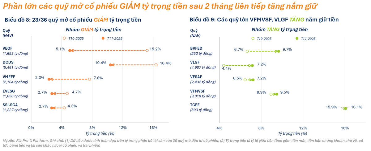 Áp lực rút ròng tại nhóm quỹ cổ phiếu hạ nhiệt rõ rệt, giảm 67,5% so với cùng kỳ xuống còn gần 982 tỷ đồng, mức thấp nhất kể từ tháng 1/2025. Nhóm quỹ cổ phiếu ghi nhận dòng tiền rút ròng giảm mạnh ở cả 3 nhóm (quỹ mở, quỹ đóng, ETF). Nhiều quỹ mở cổ phiếu tăng giải ngân. Cụ thể, có 23/36 quỹ mở cổ phiếu giảm tỷ trọng tiền trong tháng 11, đảo chiều so với tháng 10. Phần lớn các quỹ lớn đều giảm nắm giữ tiền, cho thấy tâm lý bớt phòng thủ hơn của các nhà quản lý quỹ. FPT tiếp tục dẫn đầu danh sách các cổ phiếu được quỹ mua ròng (theo khối lượng) trong tháng 11/2025. Nhóm bất động sản (NLG, DIG, KDH, HDG) cũng ghi nhận lực mua ròng lan tỏa. Ngược lại, mã HPG, ngân hàng có vốn hóa lớn (TCB, STB, CTG, VCB) và chứng khoán (SSI, BSI) nằm trong nhóm cổ phiếu bị các quỹ bán ròng mạnh.