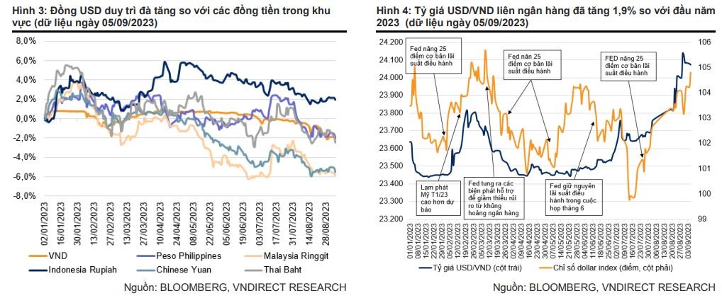 Theo ông Hinh, đà tăng được thúc đẩy bởi lo ngại về khả năng FED có thể tăng lãi suất điều hành thêm một lần nữa trong năm nay và lợi suất trái phiếu Chính phủ Mỹ tăng cao trong bối cảnh Chính phủ Mỹ đẩy mạnh phát hành để bù đắp thâm hụt ngân sách. Đồng USD mạnh lên đã gây áp lực lên tỷ giá tiền đồng, kéo tỷ giá USD/VND liên ngân hàng lên mức 24.073 tại ngày 5/9.