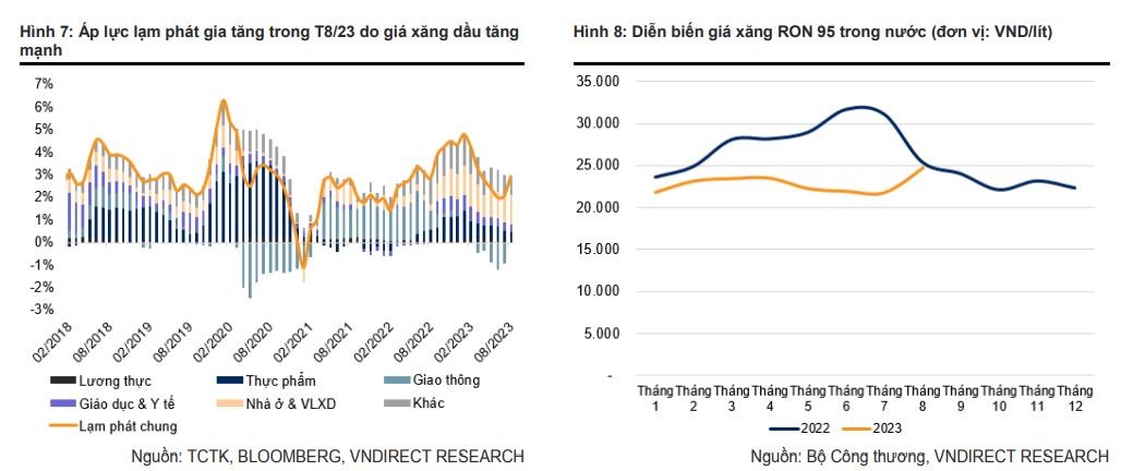 Đà tăng mạnh của giá xăng dầu tháng vừa qua đã kéo chỉ số CPI nhóm giao thông vận tải tháng 8/2023 tăng 3,85% so với tháng trước và là yếu tố gia tăng áp lực lên lạm phát. Trong khi đó, lạm phát cơ bản tăng 4,57% so với cùng kỳ trong tháng 8/2023, giảm nhẹ so với mức tăng 4,65% so với cùng kỳ trong tháng 7/2023.