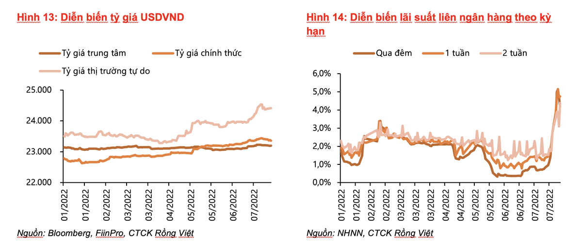 Trước những động thái điều hành kể trên, các chuyên gia phân tích của VDSC cho rằng, áp lực mất giá tiền đồng đã có dấu hiệu hạ nhiệt thể hiện qua việc lãi suất liên ngân hàng tăng mạnh lên vùng 4 - 5% khiến cho chênh lệch lãi suất USD/VND trên thị trường liên ngân hàng đã đảo chiều từ âm sang dương. Tỷ giá USD/VND thu hẹp đà tăng từ mức tăng đỉnh điểm 2,7% còn 2,3% vào cuối tháng 7.