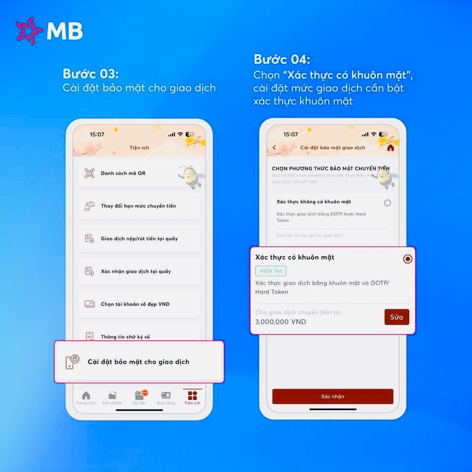 Bám sát chỉ đạo của NHNN, với mục tiêu đảm bảo an toàn trong giao dịch trực tuyến, Ngân hàng TMCP Quân đội (MB) đã nhanh chóng đón đầu công nghệ và tự hào là ngân hàng đầu tiên triển khai xác thực chuyển khoản bằng khuôn mặt, với mức tiền chuyển khoản cần xác thực tùy theo khách hàng lựa chọn.