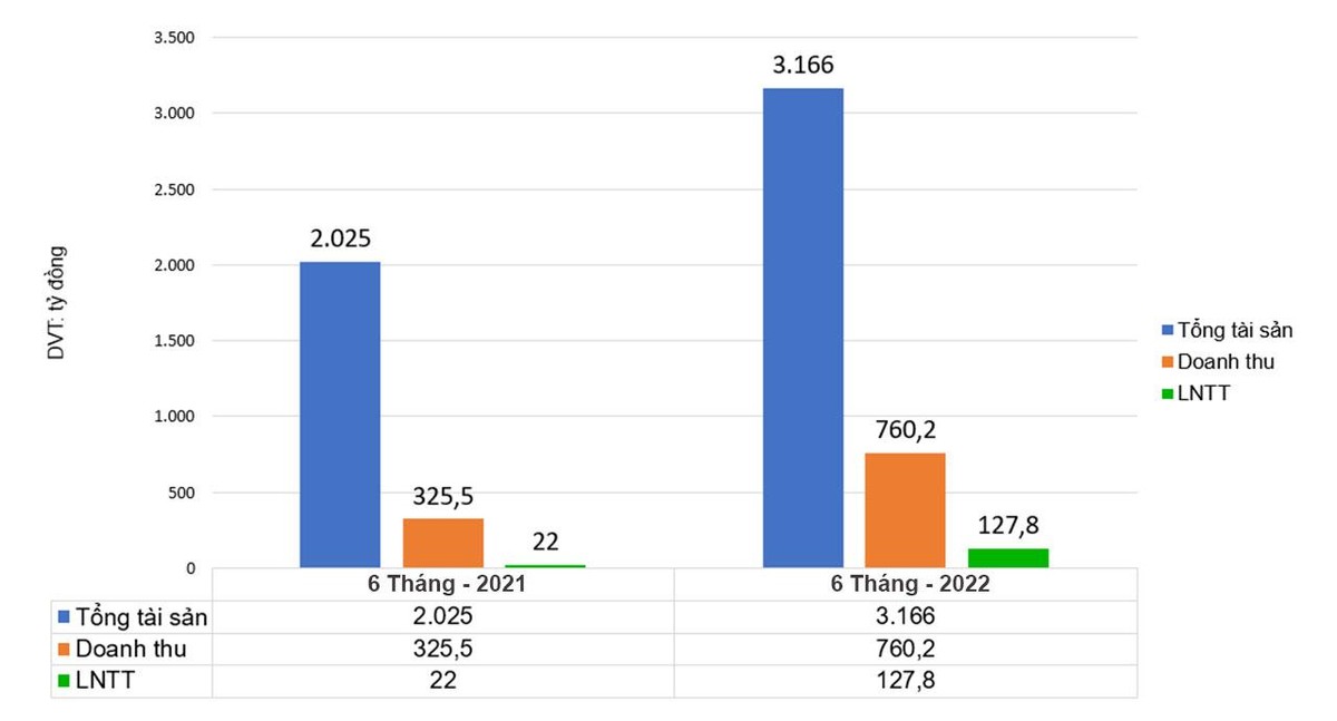 Tựu chung lại, trong 06 tháng đầu năm 2022, ASG đã đạt được kết quả kinh doanh ấn tượng với doanh thu hợp nhất đạt 760,2 tỷ đồng, tăng 2,3 lần so cùng kỳ; lợi nhuận trước thuế tăng mạnh gần gấp 5 lần từ 22 tỷ đồng lên đến 127,8 tỷ đồng. Tổng tài sản tăng trưởng 56,3% từ 2.025 tỷ đồng lên hơn 3.166 tỷ đồng so với cùng kỳ.