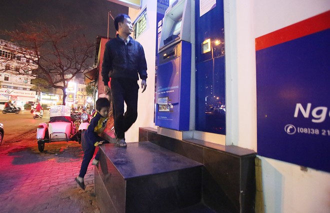 Nhiều máy ATM được thiết kế cao hơn vỉa hè nên các ngân hàng phải thiết kế bậc tam cấp để thuận tiện cho khách hàng giao dịch. Trên phố Xã Đàn, hai cha con cố leo lên bậc tam cấp kiên cố mới tiếp cận được máy.