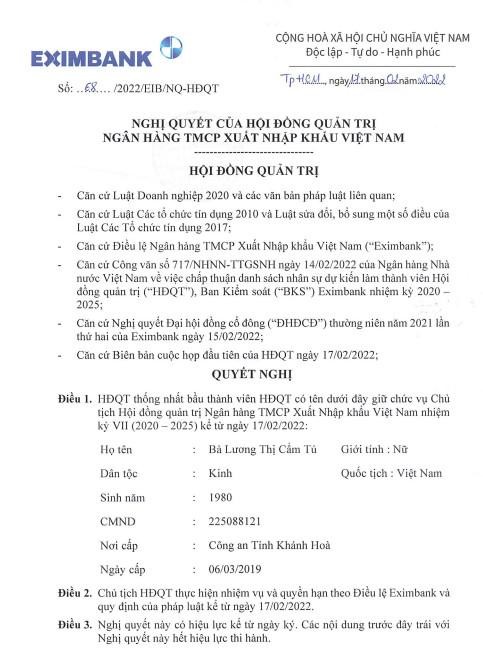 Trước đó, bà được bầu làm Thành viên Hội đồng Quản trị Eximbank trong cuộc họp Đại hội đồng cổ đông thường niên 2021 lần 2 diễn ra vào ngày 15/2, với tỷ lệ phiếu bầu 62,2%.