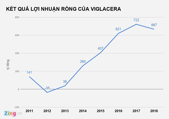 Năm 2018 vừa qua, Viglacera ghi nhận 9.013 tỷ đồng doanh thu, giảm nhẹ so với năm 2017. Khoản lợi nhuận sau thuế theo đó cũng giảm gần 8%, xuống còn 667 tỷ đồng.