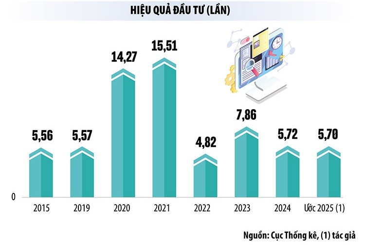 Hiệu quả đầu tư của Việt Nam dù có có xu hướng khá lên từ năm 2019 trở về trước, nhưng đã thấp xuống do đại dịch Covid-19 xuất hiện vào năm 2020 và bùng phát vào năm 2021. Năm 2022, hiệu quả đầu tư đã khá lên, song lại bị giảm trong năm 2023.