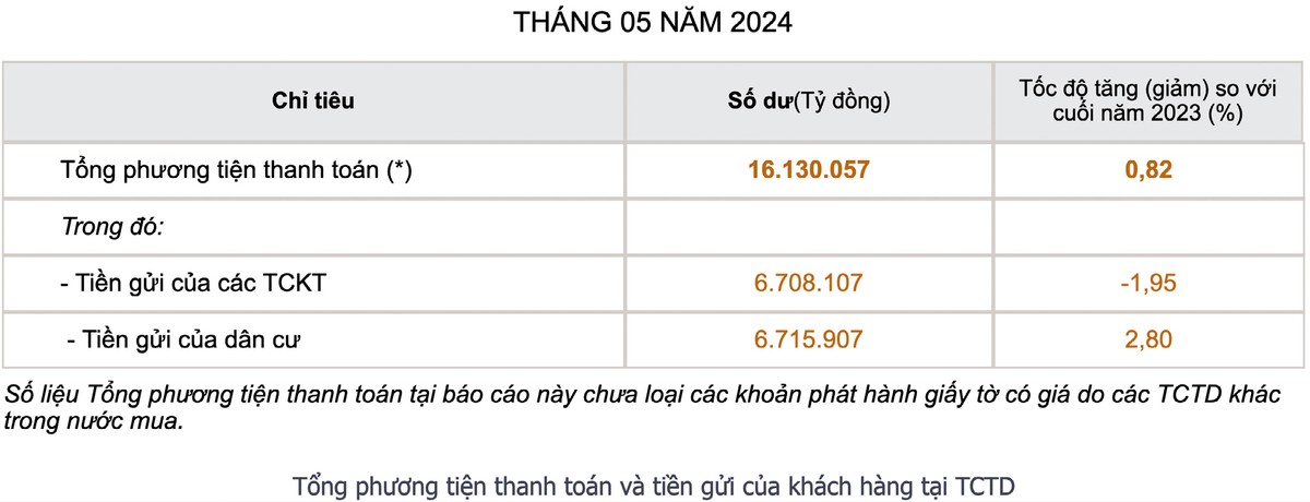 Số liệu mới nhất được Ngân hàng Nhà nước công bố cho biết, tính đến tháng 5/2024, mặc dù tiền gửi của dân cư đạt 6.715.907 tỷ đồng, tăng 2,8% so với cuối năm 2023 nhưng tiền gửi của các tổ chức kinh tế chỉ đạt 6.708.107 tỷ đồng, giảm 1,95% so với cuối năm 2023.