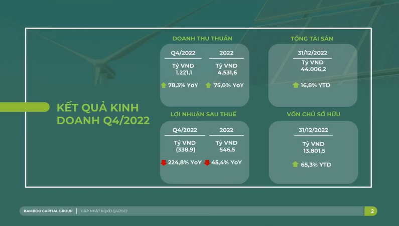 Tại buổi Livestream gặp gỡ nhà đầu tư chiều ngày 17/4, Tập đoàn Bamboo Capital (mã BCG) cho biết, trong quý IV, doanh thu thuần BCG đạt 1.221,1 tỷ đồng, tăng 78,3% so với cùng kỳ. Trong khi đó, chi phí lãi vay tăng mạnh, việc huy động vốn khó khăn làm cho thị trường M&A gần như bị đóng băng khiến BCG không thực hiện giao dịch nào trong quý VI. Điều này đã làm cho doanh thu tài chính của BCG giảm mạnh so với cùng kỳ năm ngoái, lợi nhuận sau thuế quý IV âm 339 tỷ đồng.
