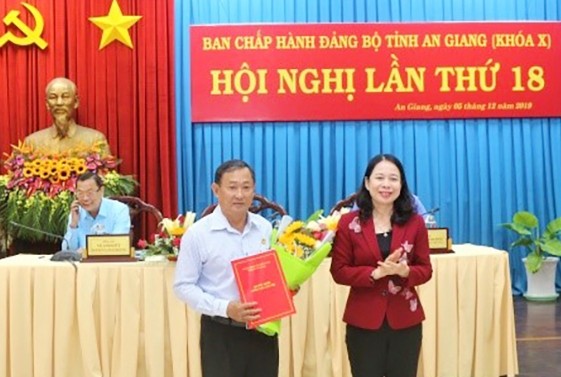 Ủy viên Trung ương Đảng, Bí thư Tỉnh ủy An Giang Võ Thị Ánh Xuân trao quyết định và chúc mừng đồng chí Nguyễn Tiếc Hùng.