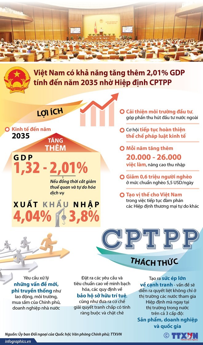 Quốc hội quyết nghị phê chuẩn Hiệp định Đối tác Toàn diện và Tiến bộ xuyên Thái Bình Dương cùng các văn kiện liên quan (tên tiếng Anh là Comprehensive and Progressive Agreement for Trans-Pacific Partnership, gọi tắt là Hiệp định CPTPP) được ký ngày 8/3/2018 tại thành phố Santiago, Cộng hòa Chile.