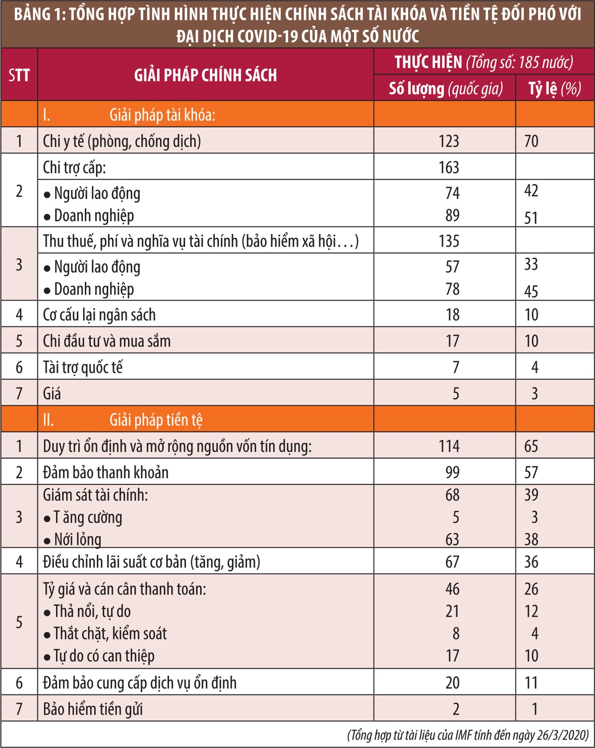 Tính đến thời điểm đầu tháng 4/2020, tình hình triển khai phối hợp chính sách tài khóa và tiền tệ của 185 nước thành viên thuộc IMF dược thể hiện tại Bảng 1 (trong đó, có những nước không áp dụng chính sách nào hoặc áp dụng nhiều chính sách đồng thời).
