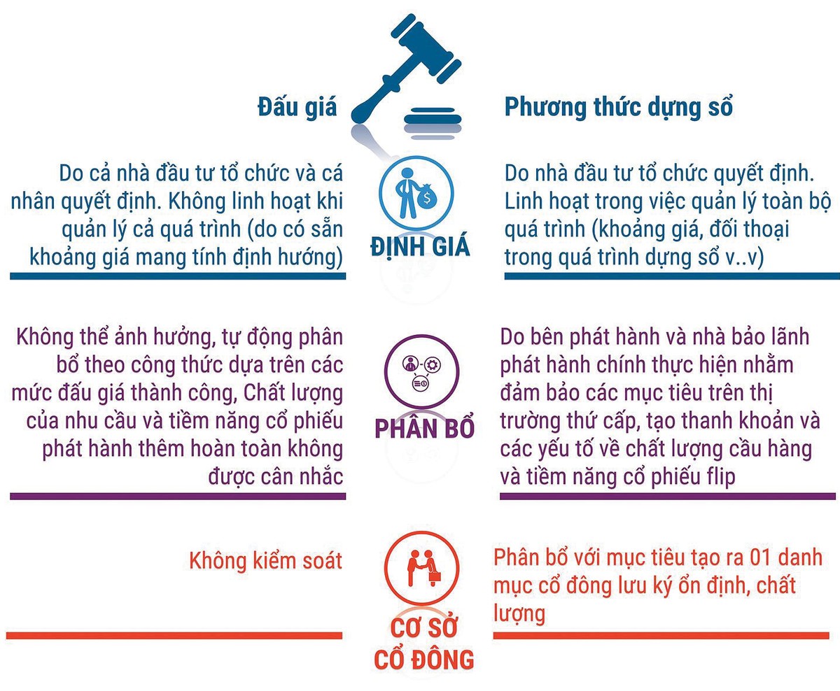 Mặt khác, với phương thức dựng sổ, bên bán nắm bắt được lượng cổ phần đưa ra chào bán được hấp thụ ở mức nào, với giá cụ thể là bao nhiêu, chứ không như phương thức đấu giá công khai không lường tính được sức mua của nhà đầu tư.