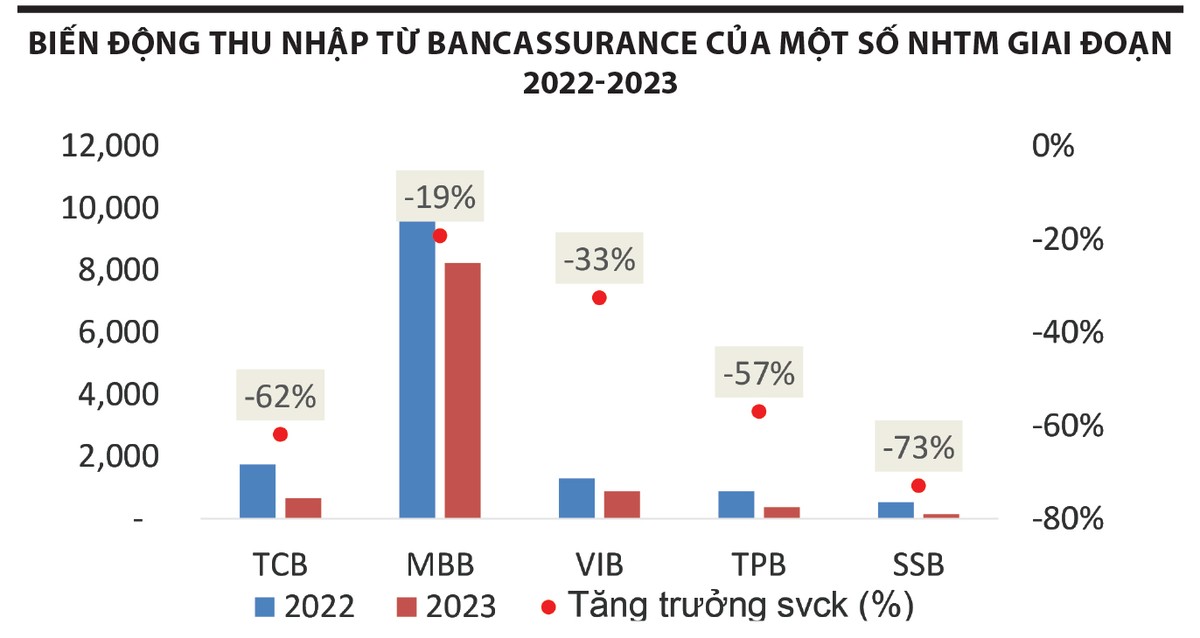 Vì vậy, đa phần các ngân hàng thương mại đều ghi nhận việc giảm doanh thu từ bancassurance trong năm 2023, tuy nhiên không phải ngân hàng nào cũng công bố con số này. SeA Bank, Techcombank và TPBank báo cáo thu nhập từ bancassurance giảm lần lượt 73%, 62% và 57% trong năm 2023. VIB công bố thu nhập từ mảng này giảm 33%, trong khi MBB có mức giảm tương 19%.