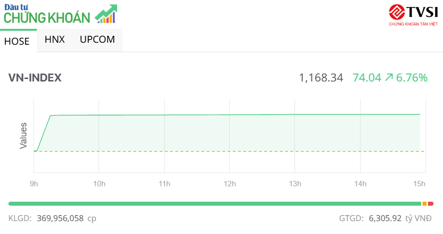 Đóng cửa, sàn HOSE có 534 mã tăng, trong đó, có tới 372 mã tăng kịch trần và chỉ 7 mã giảm, chỉ số VN-Index tăng 74,04 điểm (+6,77%), lên 1.168,34 điểm. Tổng khối lượng giao dịch đạt gần 370 triệu đơn vị, giá trị hơn 6.305,9 tỷ đồng, trong khi phiên hôm qua khớp hơn 1,16 tỷ đơn vị, giá trị hơn 32.402 tỷ đồng. Giao dịch thỏa thuận đóng góp hơn 89,6 triệu đơn vị, giá trị 1.646 tỷ đồng.