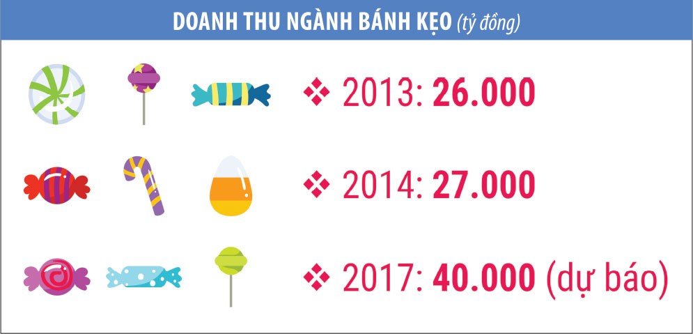 Theo kết quả nghiên cứu của BMI, doanh thu ngành bánh kẹo Việt năm 2014 là hơn 27.000 tỷ đồng và dự báo đến năm 2018 sẽ đạt khoảng 40.000 tỷ đồng, tương đương 1,76 tỷ USD. Để phân chia miếng bánh "khủng" này, các doanh nghiệp nội và ngoại liên tục đưa ra những sản phẩm mới cùng chiến lược cạnh tranh mạnh mẽ.