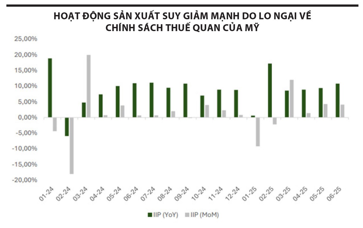 Trái ngược với IIP, chỉ số Nhà quản trị mua hàng (PMI) - vốn mang tính chất dự báo - chỉ đạt 48,9 điểm trong tháng 6, duy trì dưới ngưỡng 50 điểm ba tháng liên tiếp. Điều này cho thấy tâm lý thận trọng của doanh nghiệp trước môi trường kinh doanh còn nhiều bất định.