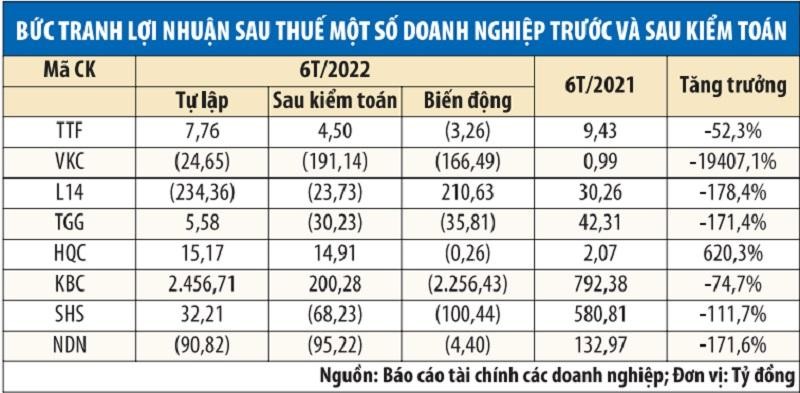 Sau kiểm toán bán niên năm 2022, một số doanh nghiệp niêm yết trên sàn có dấu hiệu chuyển từ lãi sang lỗ như Công ty cổ phần Louis Capital (mã TGG) từ lãi 5,58 tỷ đồng thành lỗ 30,23 tỷ đồng, tức giảm tới 35,81 tỷ đồng; Công ty cổ phần Chứng khoán Sài Gòn - Hà Nội (mã SHS) chuyển từ lãi 32,21 tỷ đồng sang lỗ 68,23 tỷ đồng, tức giảm tới 100,44 tỷ đồng…