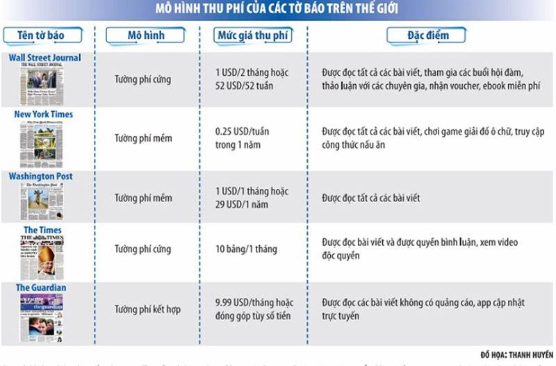 Ở các tờ báo trên thế giới, việc thu phí được thực hiện theo nhiều cách thức. Phổ biến nhất là thiết lập bức tường thu phí mềm (cho phép người dùng truy cập một số nội dung kỹ thuật số dựa trên các tiêu chí được thiết lập bởi các tòa soạn báo điện tử), bức tường thu phí cứng (chỉ cho phép khách truy cập bất kỳ nội dung nào nếu khách hàng đăng ký thuê bao trả phí hàng tháng, quý, năm), hình thức hỗn hợp và trả phí đọc các bài báo của nhiều tờ báo qua các app.