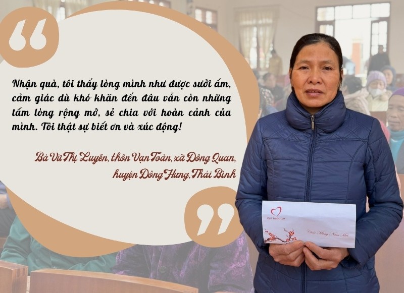 Trong dòng người tấp nập, phóng viên Báo Đầu tư có cơ hội trò chuyện với bà Vũ Thị Luyến, thôn Vạn Toàn, xã Đông Quan, huyện Đông Hưng, Thái Bình. Bà nghẹn ngào chia sẻ: "Gia đình tôi trước đây có 4 người, nhưng con lớn đến 18 tuổi thì mất vì ung thư, giờ chỉ còn lại 3 người. Tôi bị bệnh về mắt, phải sống chung với nó cả đời, còn chồng thì mắc bệnh tâm thần. Những ngày thường đã khó khăn, đến dịp cuối năm lại càng chật vật hơn. Tuy nhiên, cứ mỗi năm vào tầm này, tôi lại được nhận những món quà nghĩa tình từ Báo Đầu tư và Quỹ Thiện Tâm. Nhận quà, tôi thấy lòng mình như được sưởi ấm, cảm giác rằng dù khó khăn đến đâu vẫn còn những tấm lòng rộng mở, chia sẻ với hoàn cảnh của mình. Tôi thật sự biết ơn và xúc động!"