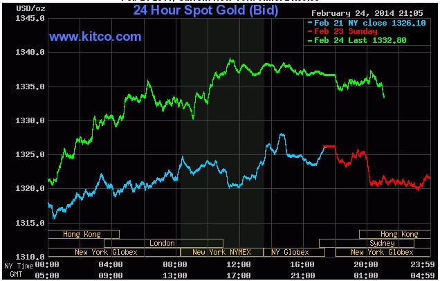 Giá vàng giao tháng 4 đã tăng 1,1% lên mức 1.338 USD/ounce vào lúc 1h43 chiều trên sàn Comex Mỹ, sau khi chạm mức 1.339,2 USD/ounce, mức cao nhất kể từ ngày 31/10/2013.