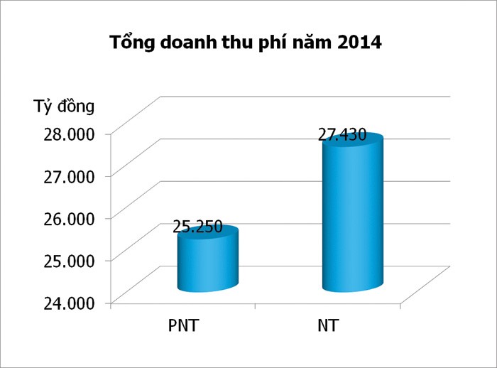 Năm 2014, tổng doanh thu phí bảo hiểm toàn thị trường ước đạt 52.680 tỷ đồng, tăng 14,2% so với năm 2013. Trong đó, doanh thu phí bảo hiểm phi nhân thọ ước đạt 25.250 tỷ đồng, tăng 10,5%; doanh thu phí bảo hiểm nhân thọ ước đạt 27.430 tỷ đồng, tăng 17,9%.