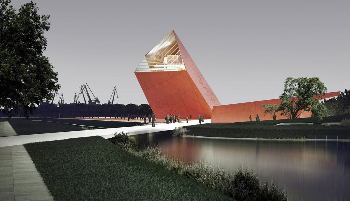 Trong khi đó, Kwadrat Studio, tác giả của công trình này cho rằng, Viện bảo tàng là một thiết kế trầm lặng, với dụng ý gợi lên những cảm xúc mạnh mẽ và phản chiếu vào chiều sâu tâm hồn của người nhìn. Viện bảo tàng Chiến tranh thế giới thứ II được chia làm 3 không gian, là biểu tượng cho mối liên hệ giữa quá khứ - hiện tại - tương lai: quá khứ là phần ngôi nhà bên dưới mặt đất, hiện tại là không gian mở xung quanh tòa nhà và tương lai được thể hiện bằng cấu trúc vươn lên, bao gồm cả phần bệ đỡ.