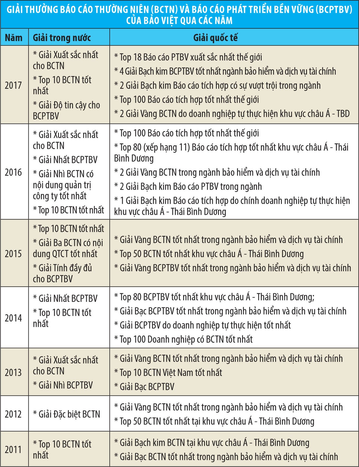 Năm 2017, Bảo Việt tiếp tục được vinh danh với những giải thưởng cao dành cho các báo cáo, điều đó khẳng định vai trò tiên phong của Bảo Việt trong đổi mới quản trị doanh nghiệp và minh bạch hóa thông tin, phản ánh rõ nét những cam kết của Tập đoàn trong việc hiện thực hóa mục tiêu phát triển bền vững thành hành động, vì tương lai của doanh nghiệp và của cộng đồng”.