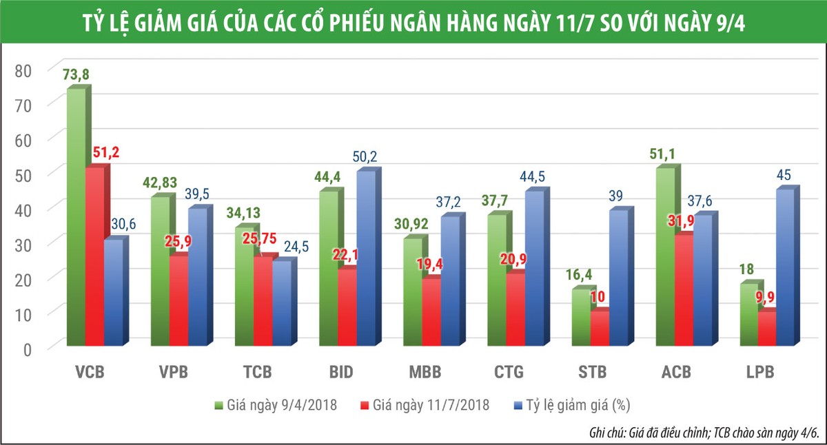 Thống kê cho thấy, nhóm cổ phiếu ngân hàng đã ghi nhận mức giảm giá mạnh trong 3 tháng trở lại đây. Chẳng hạn, giá cổ phiếu BID, CTG, LPB giảm từ 45 - 50% so với thời điểm VN-Index đạt đỉnh. Hay VPB, MBB, STB, ACB giảm giá gần 40%. Đây hầu hết là các cổ phiếu được nhà đầu tư giao dịch ký quỹ (margin) nên khi giá giảm, nhà đầu tư càng thiệt hại hơn.