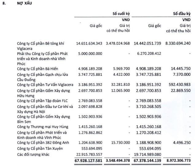 Tính đến cuối kỳ, Viglacera đang ghi nhận gần 68 tỷ đồng nợ xấu, trong đó có nhiều khoản nợ từ các công ty “họ” Viglacera như CTCP Bê tông khí Viglacera, CTCP Tư vấn Viglacera… Đáng chú ý, một doanh nghiệp niêm yết khác là CTCP Tập đoàn FLC cũng nằm trong “danh sách đen” của Viglacera với khoản nợ xấu 2,8 tỷ đồng và được trích lập dự phòng toàn bộ, không có khả năng thu hồi.