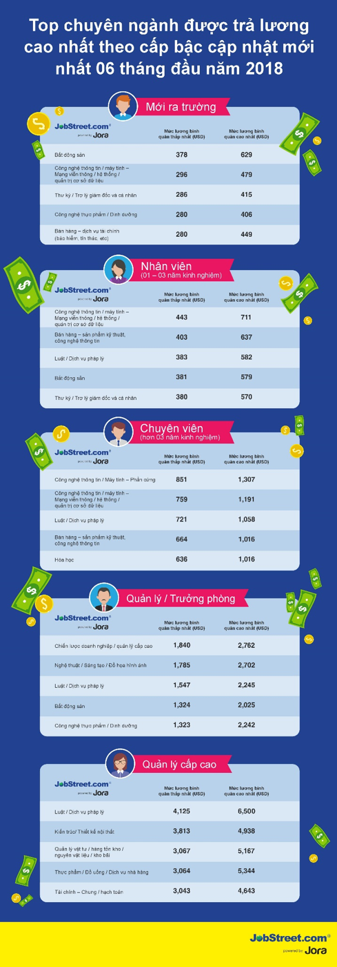 Theo Báo Cáo Lương 6 tháng đầu năm 2018 của JobStreet.com Việt Nam dựa trên 40.000 mẩu tin tuyển dụng vào 6 tháng đầu năm 2018 trên trang JobStreet.com, từ 40 chuyên ngành trong 50 lĩnh vực, dịch vụ luật/pháp lý, bất động sản và công nghệ thông tin/máy tính là 3 ngành trả lương cao cho hầu hết các cấp bậc vị trí.
