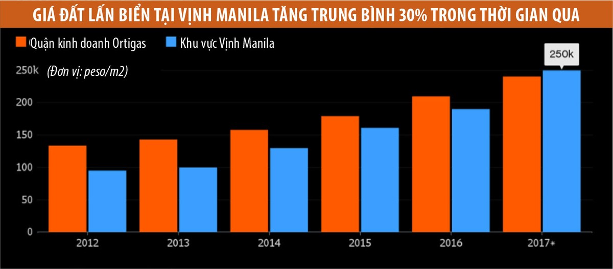 Giá bất động sản lấn biển tại khu vực Vịnh Manila, vốn đang là nơi đóng đô của các casino nổi tiếng bậc nhất như City of Dreams Manila, Solaire Resort and Casino, dự kiến sẽ tăng 30%, lên mức 250.000 pesos (4.900 USD)/m2 cho tới cuối năm nay, theo Colliers International. Mức giá này vượt xa so với đất đai tại khu vực Ortigas, nổi danh hàng thập kỷ qua nhờ sự phát triển của hoạt động kinh doanh, văn phòng, bán lẻ tại quốc gia Đông Nam Á này.