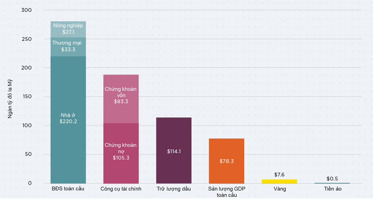 Cụ thể, tổng giá trị bất động sản trên toàn thế giới tính đến cuối năm 2017 có giá trị 280,6 ngàn tỷ USD, với khoảng 78% giá trị đến từ bất động sản nhà ở. Năm 2017, tổng sản lượng GDP toàn cầu khoảng 78,3 ngàn tỷ USD, tức, chỉ bằng 30% giá trị bất động sản.