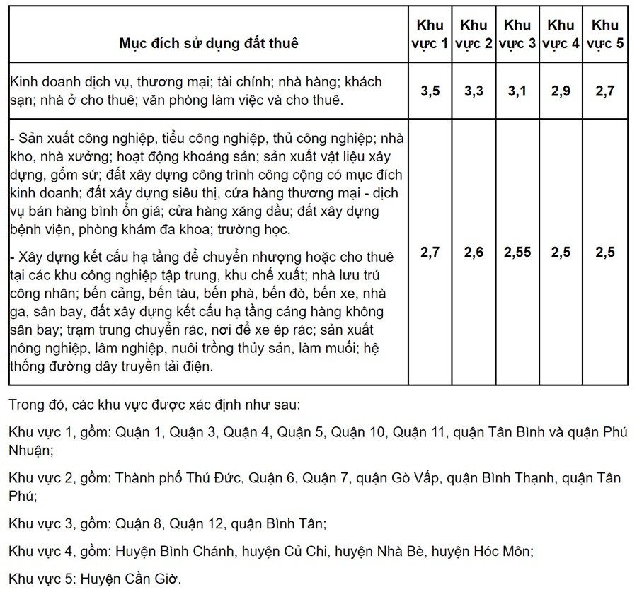 Nhóm 2: Trường hợp xác định đơn giá thuê đất hàng năm cho chu kỳ ổn định đầu tiên; xác định đơn giá thuê đất hàng năm khi điều chỉnh lại đơn giá thuê đất cho chu kỳ ổn định tiếp theo; xác định giá khởi điểm trong đấu giá quyền sử dụng đất để cho thuê theo hình thức thuê đất trả tiền thuê đất hàng năm; xác định đơn giá thuê đất khi nhận chuyển nhượng tài sản gắn liền với đất thuê thì áp dụng hệ số điều chỉnh giá đất được áp dụng tùy theo mục đích sử dụng đất và khu vực (xem bảng).
